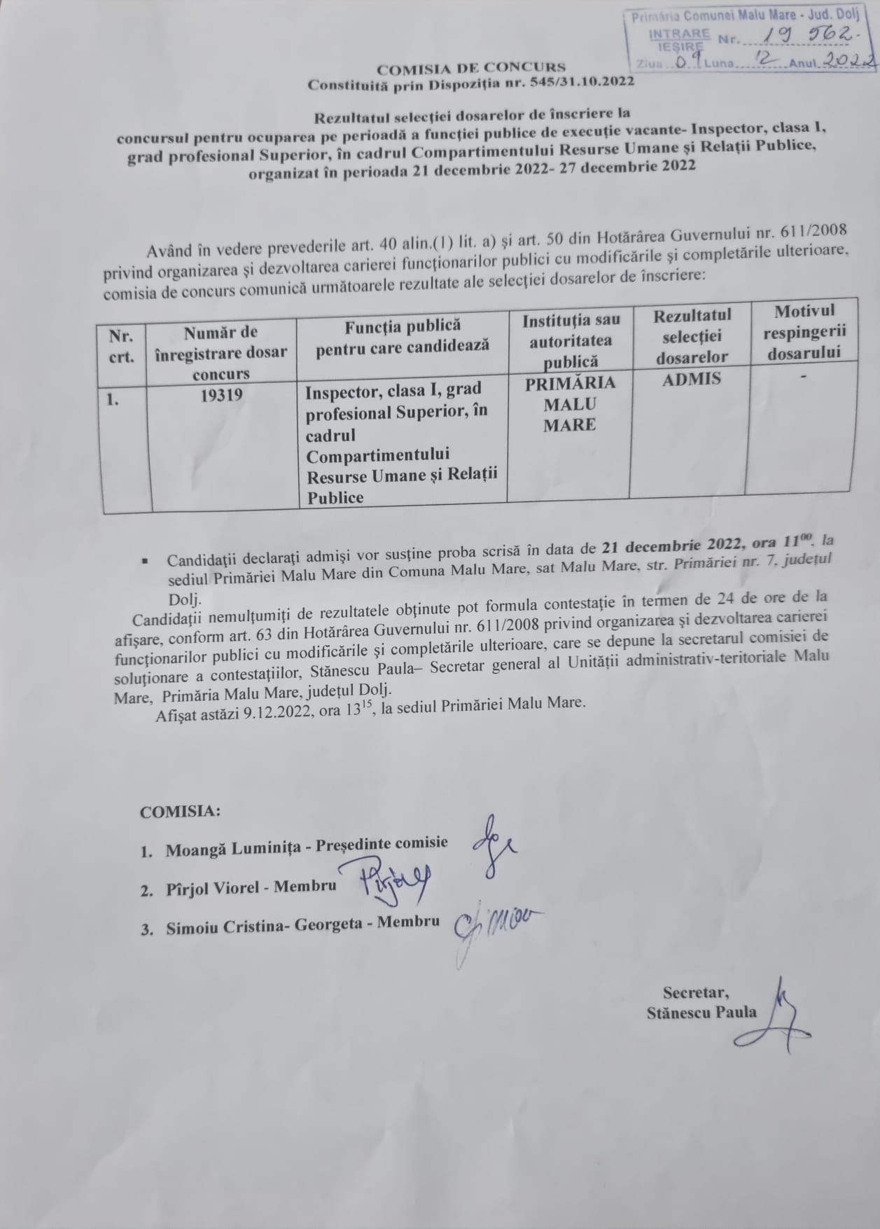 Anunt organizare concurs pentru- Inspector, clasa I, grad profesional Superior, în cadrul Compartimentului Resurse Umane si Relații Publice.