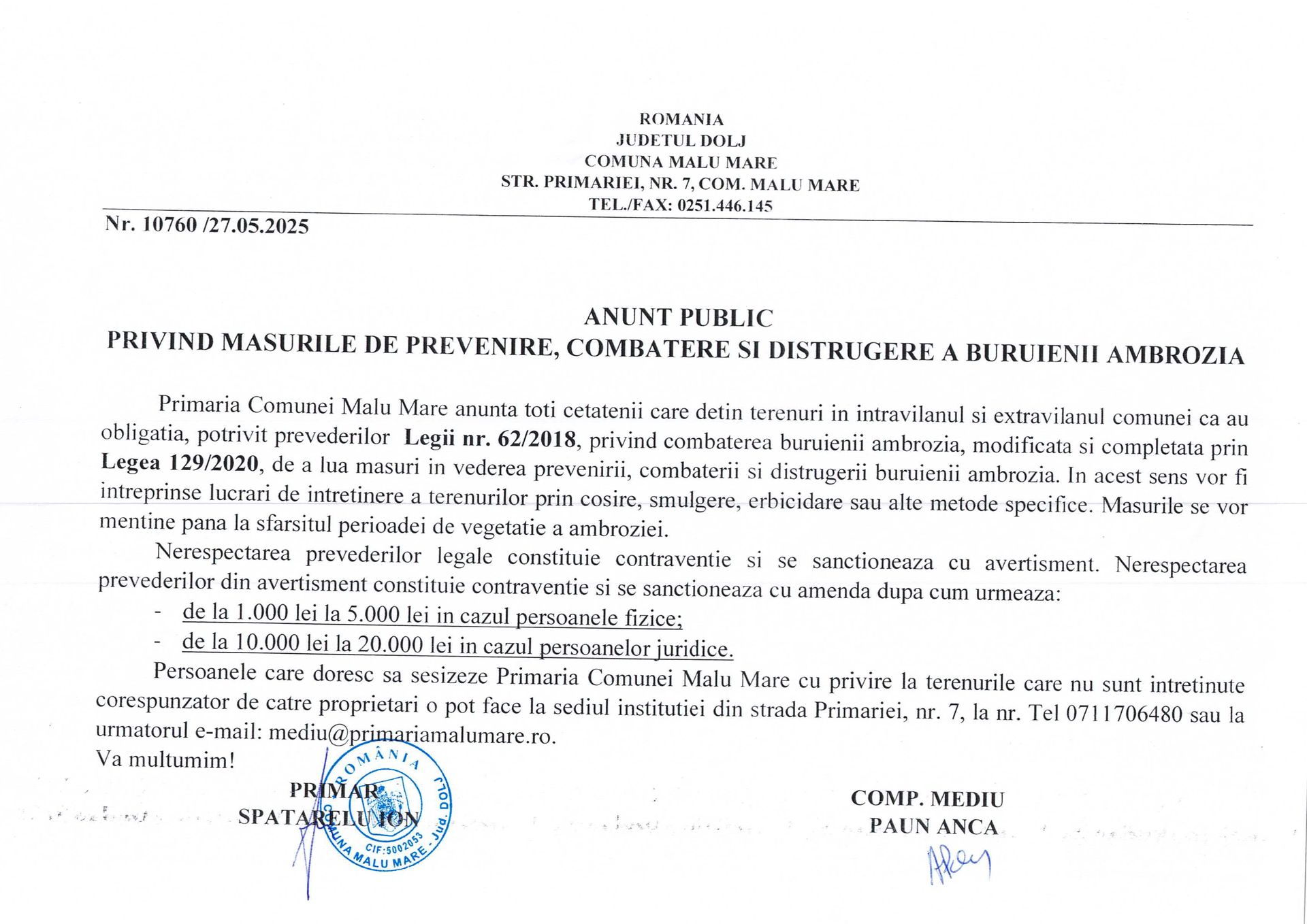 Anunt privind masurile de prevenire, combatere si distrugere a buruienii AMBROZIA
