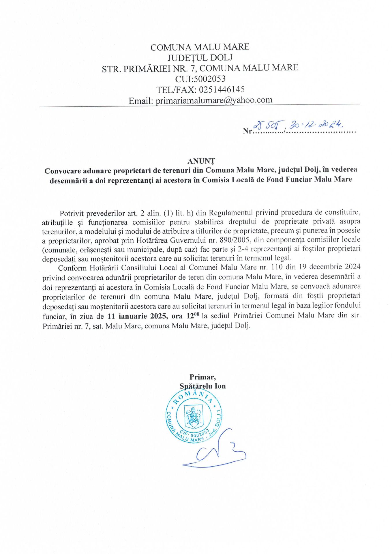 Anunt convocare adunare proprietari de terenuri Comisia Locala de Fond Funciar Malu Mare