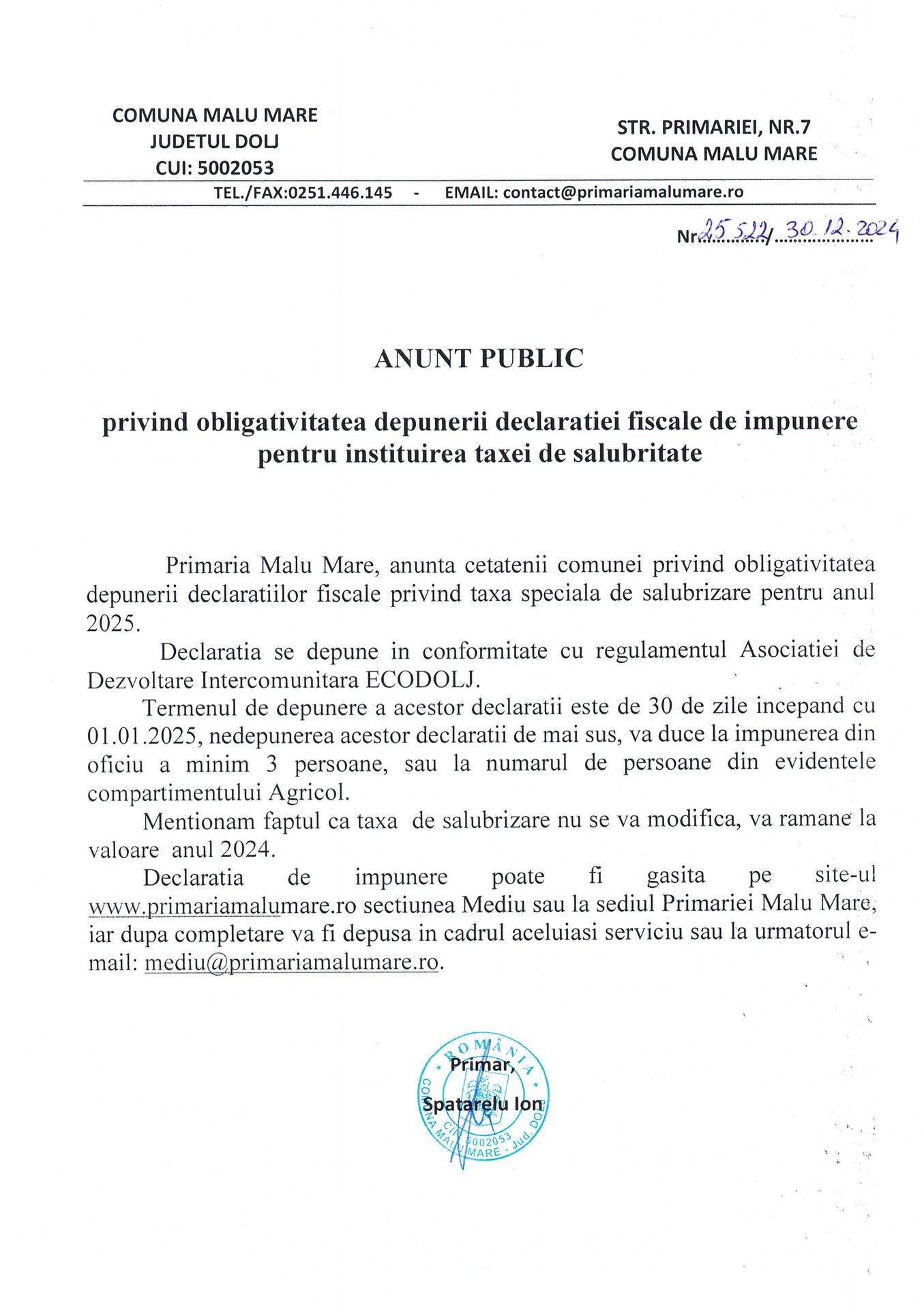 ANUNT PUBLIC privind obligativitatea depunerii declarației fiscale de impunere pentru instituirea taxei de salubritate